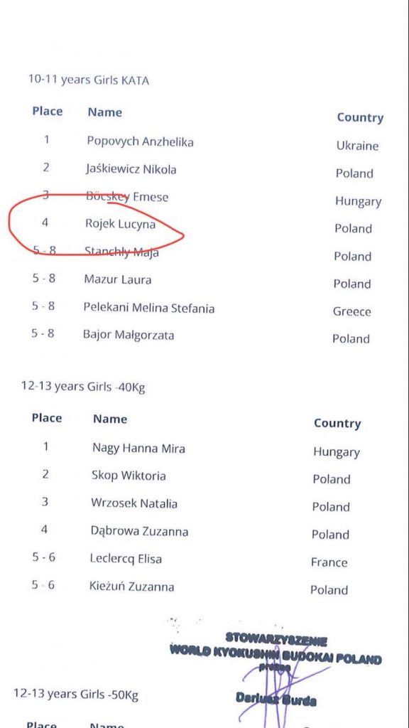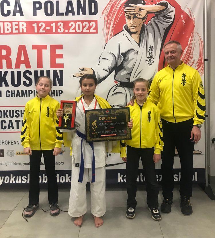 Natalia Czerniawska III miejsce w swojej kategorii wagowej na V Wagowych Mistrzostwach Europy Dębica 2022.12-13.11.2022 w Dębicy odbyły się Mistrzostwa Europy Kyokushin Karate. Startowało 620 zawodniczek i zawodników z ok 100 Klubów z 17 krajów. We wszystkich katagoriach wagowych walki odbywały się w japońskich przepisach Kyokushin z możliwością stosowania pełnej siły wszystkich kopnięć i uderzeń.Nasz Klub reprezentowały cztery zawodniczki: Gabriela Bląkała, Lucyna Rojek,Lena Wolszczak i Natalia Czerniawska. W kategorii KATA Lucyna Rojek, oceniana systemem punktowym, zakwalifikowała się do ósemki zawodniczek Mistrzostw. W drugiej turze uplasowała  się na czwartym miejscu. W kataegorii KATA strefa medalowa to trzy miejsca więc wynik Lucyny to duże osiągnięcie na tak prestiżowym Turnieju. Trudne walki ze starszymi zawodniczkami stoczyły Gabrysia i Lena, zatrzymały się na 1/8 finału. Natalia Czerniawska zdobyła III miejsce, w czwartej walce ustępując Litwince Polinie Martseniuk, która zajęła I miejsce w Europie. Pragnę podziękować naszym zawodniczkom, ich rodzicom i wszystkim ćwiczącym w naszym Klubie. Możliwość startu i sukces na Mistrzostwach Europy to wypadkowa pracy wszystkich ćwiczących i wszystkich zaangażowanych w pracę Klubu. To sukces, który wypracowali wszyscy ćwiczący w Radomskiej Akademii Kyokushin Karate.